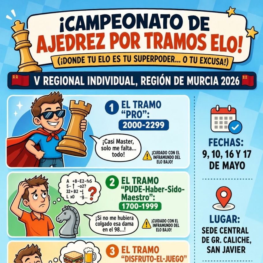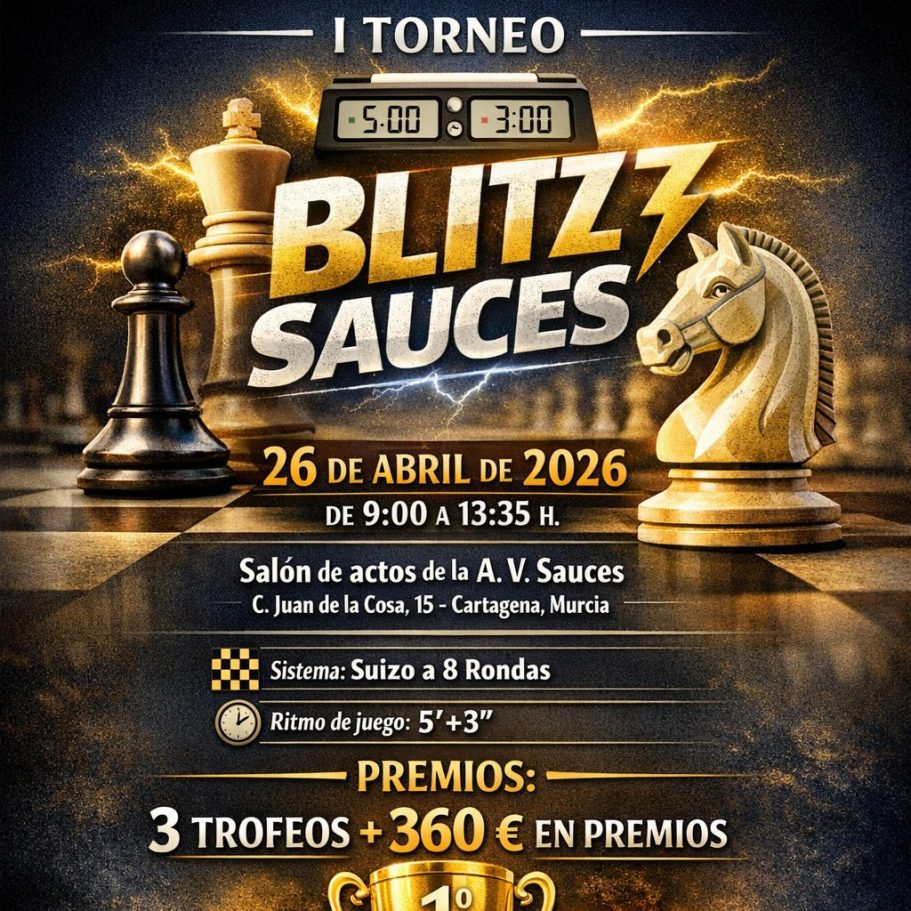 El domingo 26 se disputa en la AAVV Sauces de Cartagena el I Blitz Sauces a un ritmo de 5 minutos con 3 segundos de incremenento.